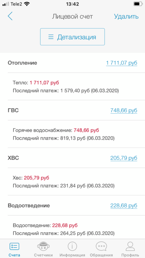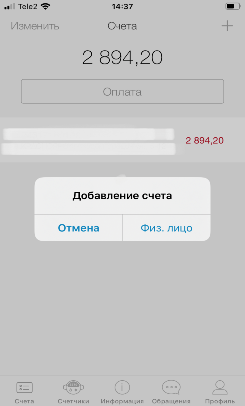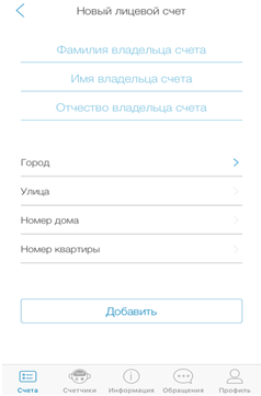 Добавить еще один Лицевой счет Вы можете во вкладке "счета" с помощью знака «плюс» в правом верхнем углу. Вам необходимо ввести данные, которые запрашивает приложение - ФИО собственника, город и адрес.