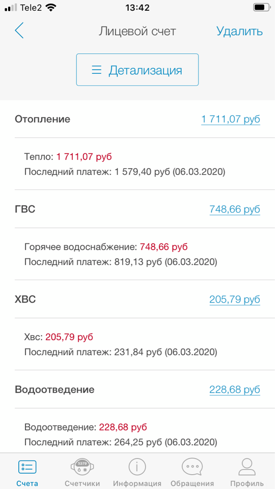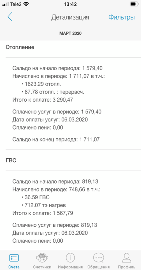 С информацией о начислениях Вы можете ознакомиться во вкладке "Счета" или нажав на вкладку "Детализация"