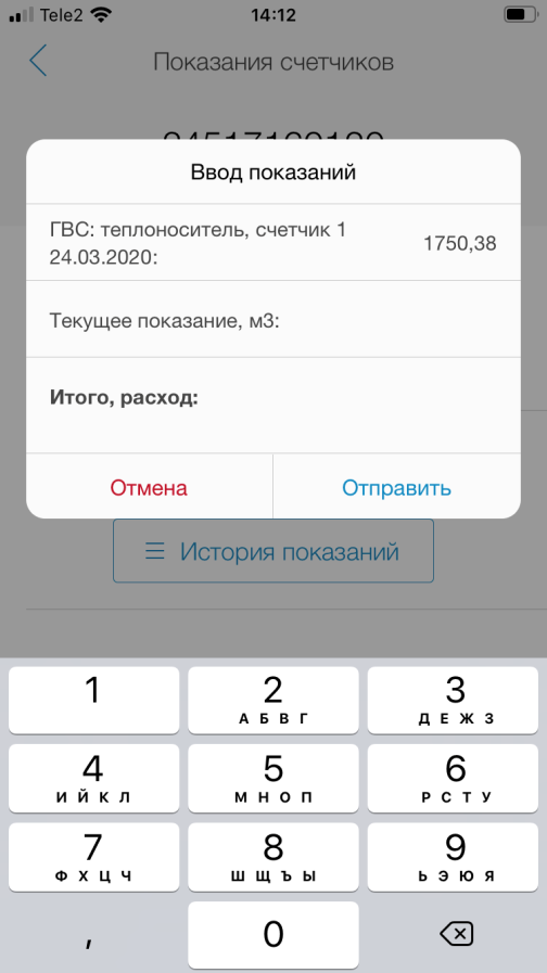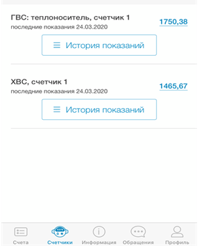 Передать показания Вы можете во вкладке "Cчетчики" , здесь же Вы сможете ознакомиться с историей показаний. При переходе во вкладку "История показаний" Вы сможете ознакомиться с информацией о дате поверки прибора. Необходимо нажать на предыдущее показание (подсвечивается голубым цветом) и ввести текущее показание (рекомендуется вводить первые 5 цифр до запятой без учета впередистоящих нулей, дробную часть (3 знака) можно не вводить , округлить до целых).