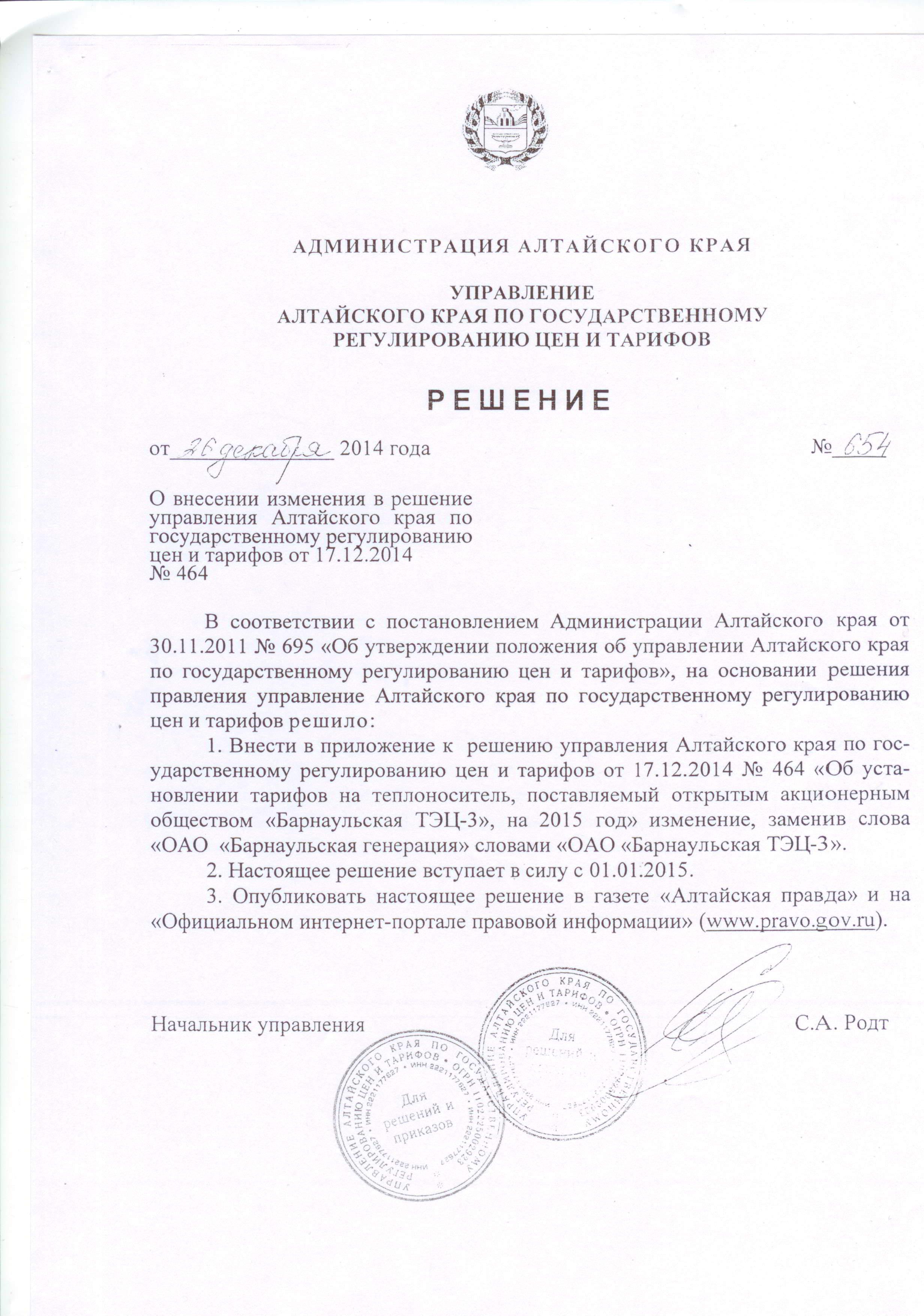 Решение Управления Алтайского края по государственному регулированию цен и тарифов от 26 декабря 2014 года № 655 Об установлении тарифов на горячую воду в закрытой системе горячего водоснабжения, поставляемую ОАО "Барнаульская генерация" потребителям муниципального образования города Барнаула Алтайского края на 2015 год
